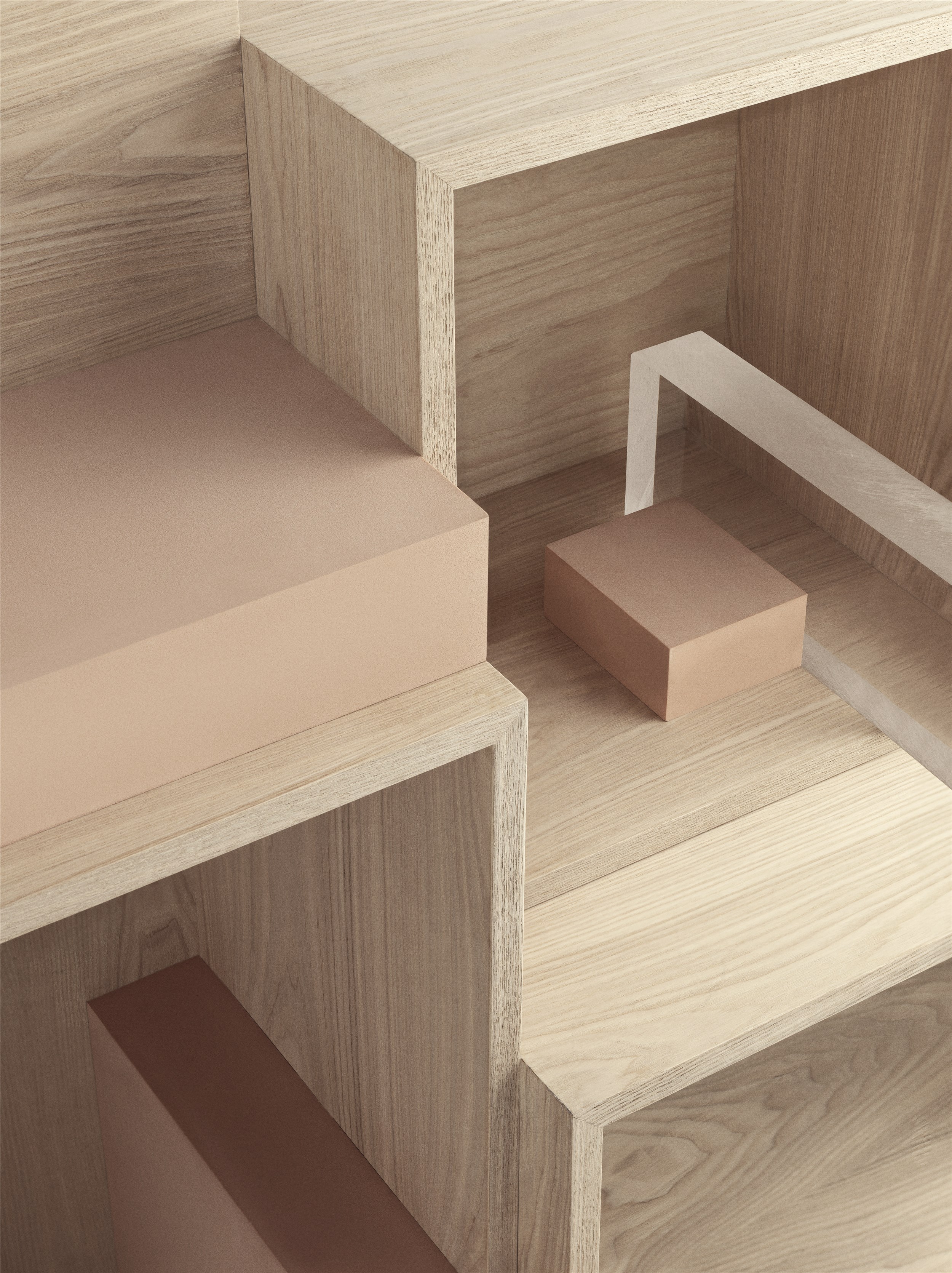 Using the Stacked Podium, you can create storage settings within the room, here in a simple configuration that echoes the simplicity and materiality of Scandinavian design while serving as a functional storage element and room divider at one and the same time.