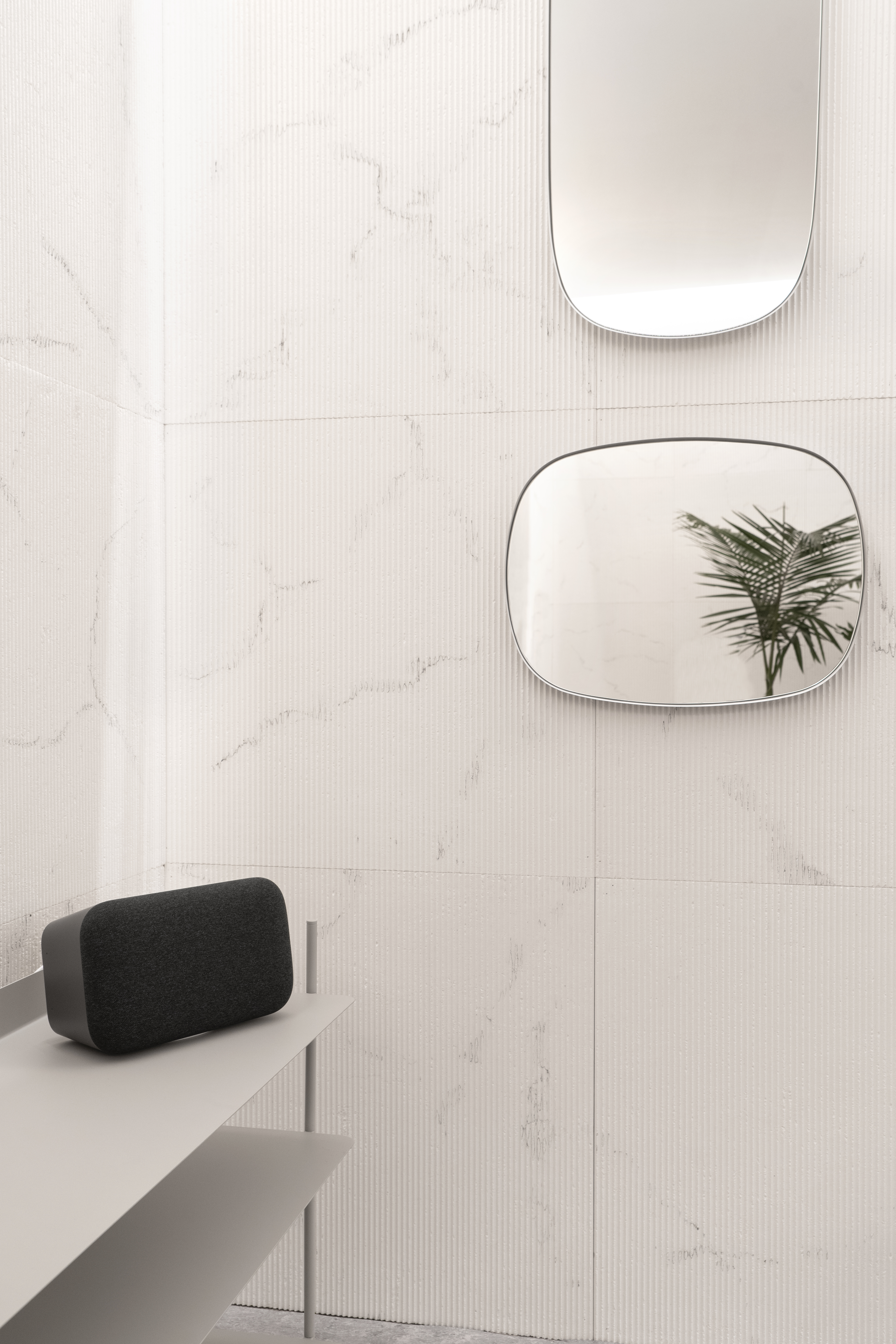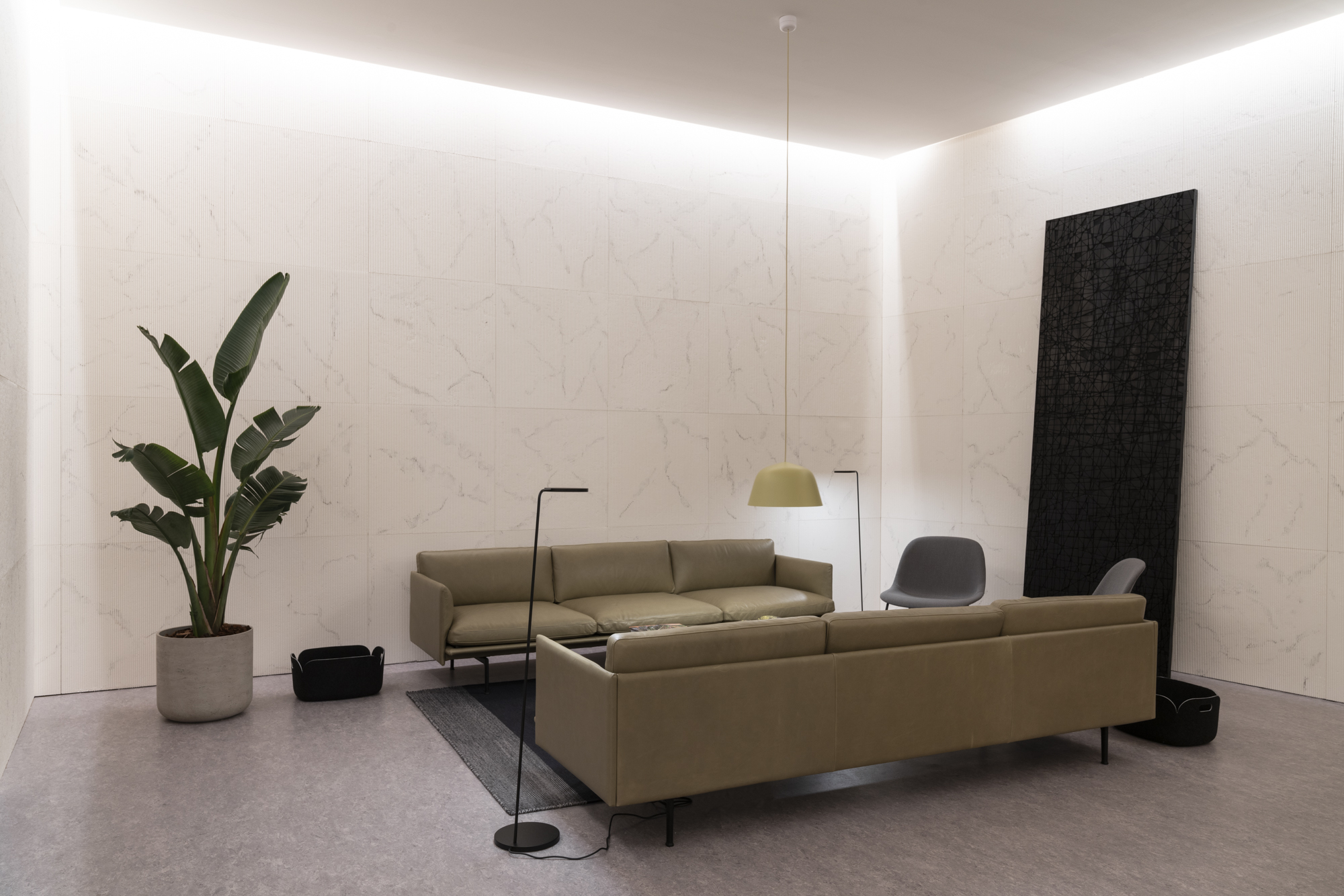 Walking through the next transition space, guests enter the third and final room, dubbed "Transformative", defined through its honest and elegant sentiment Here, marbled paper materials adorn the walls along with a subtle laminate flooring. The space features the Outline Sofa in its 3½-Seater version, upholstered in the Stone Refine Leather for a refined expression, placed with the Workshop Coffee Table and Fiber Lounge Chair in a dark toned Vidar upholstery.