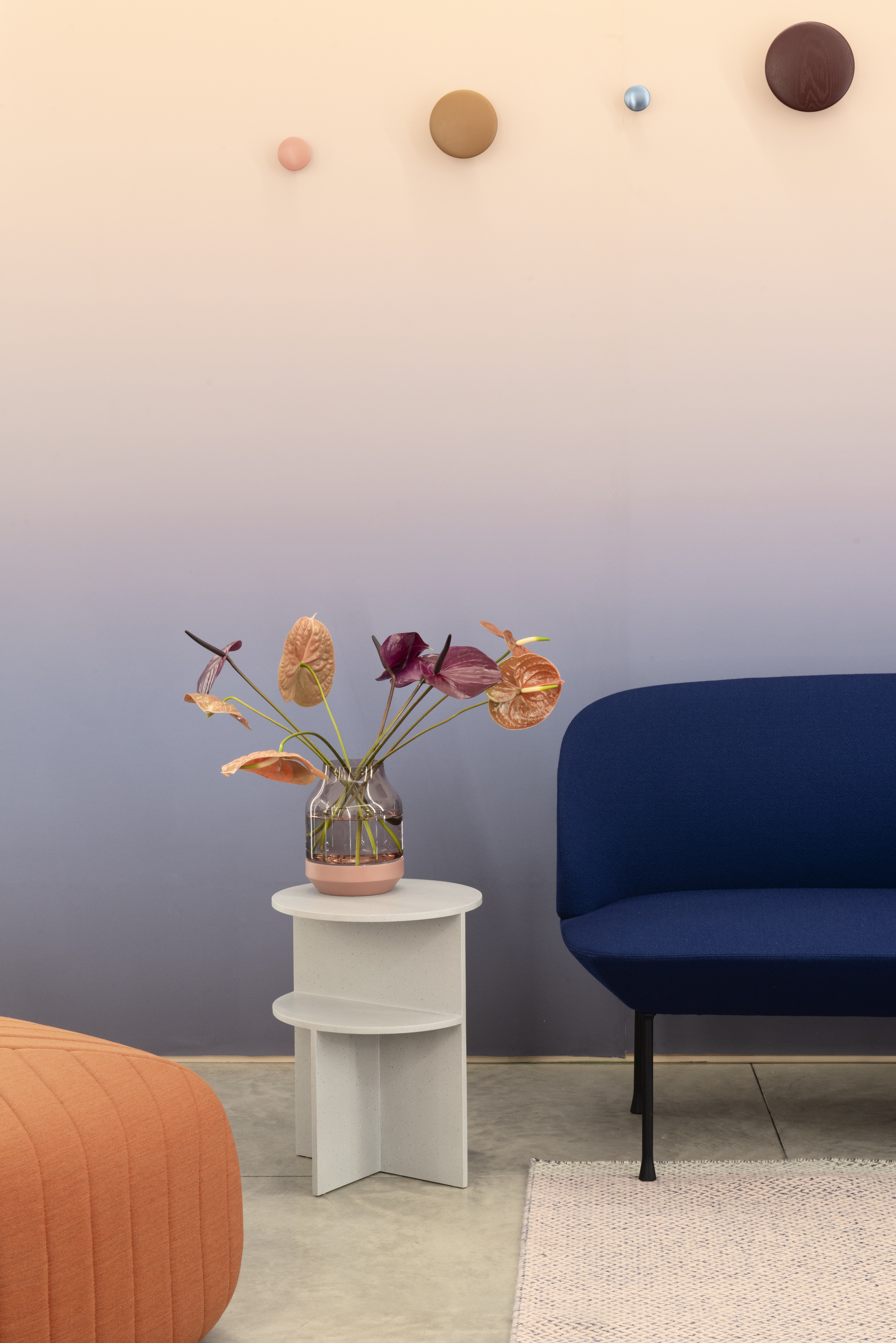 The second room, named "Vital", seeks to create a vibrant and playful atmosphere. On the walls, a colored gradient unfolds with integrated LED lights and an artful installation of The Dots Coat Hooks. In the space, the contemporary shapes of the Oslo Sofa Series is presented in a vibrantly blue upholstery alongside orange Five Poufs and Halves Side Tables.
