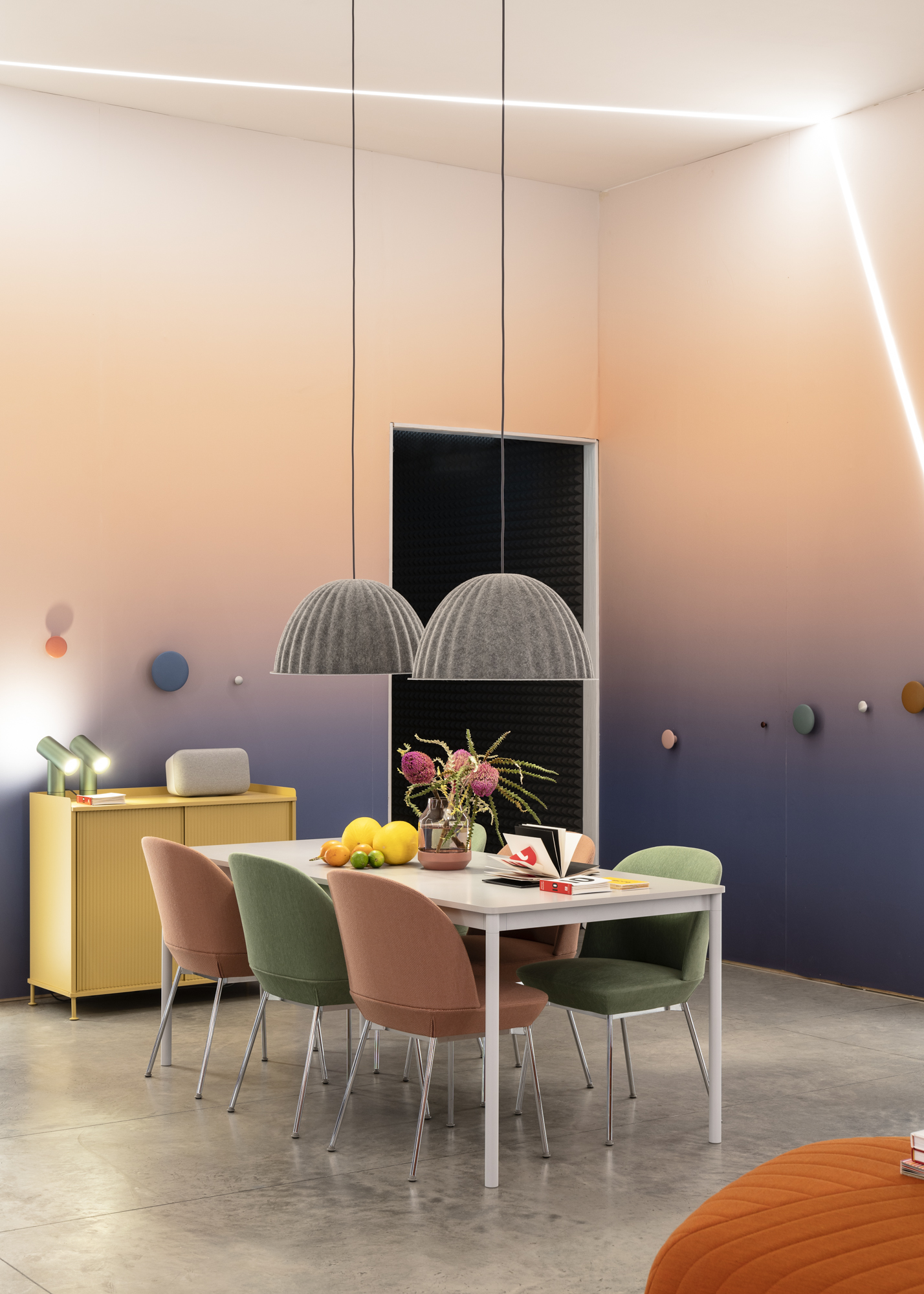 In the dining setting of the Vital room, a monochrome version of the Base Table in Grey is placed with the new Oslo Side Chair in colorful upholsteries of Still and Twill Weave by Kvadrat, placed under the Under The Bell Pendant Lamp. Walking through the space, a vibrant yet balanced soundscape with percussive rhythms is played alongside a scent of citrus and floral spices, floating gently in the air.