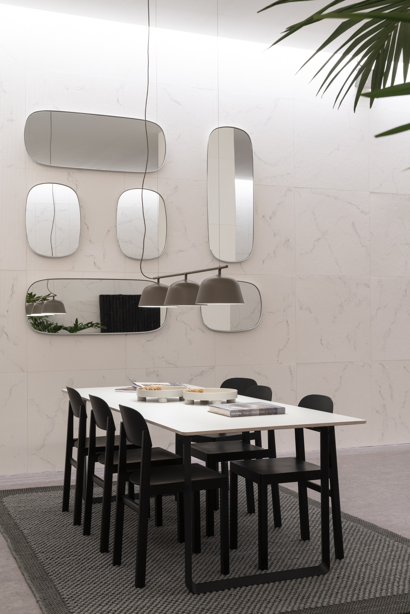 In the far end of the room is its dining setting with Black version of the Workshop Chair around a 70/70 Table and the Ambit Rail Lamp in its new color Taupe on top. Adding a sculptural element to the space is a wall installation of Framed Mirrors. For its scent, the Transformative room featured fresh, wood-like scents while a soundscape of string instruments and piano played.