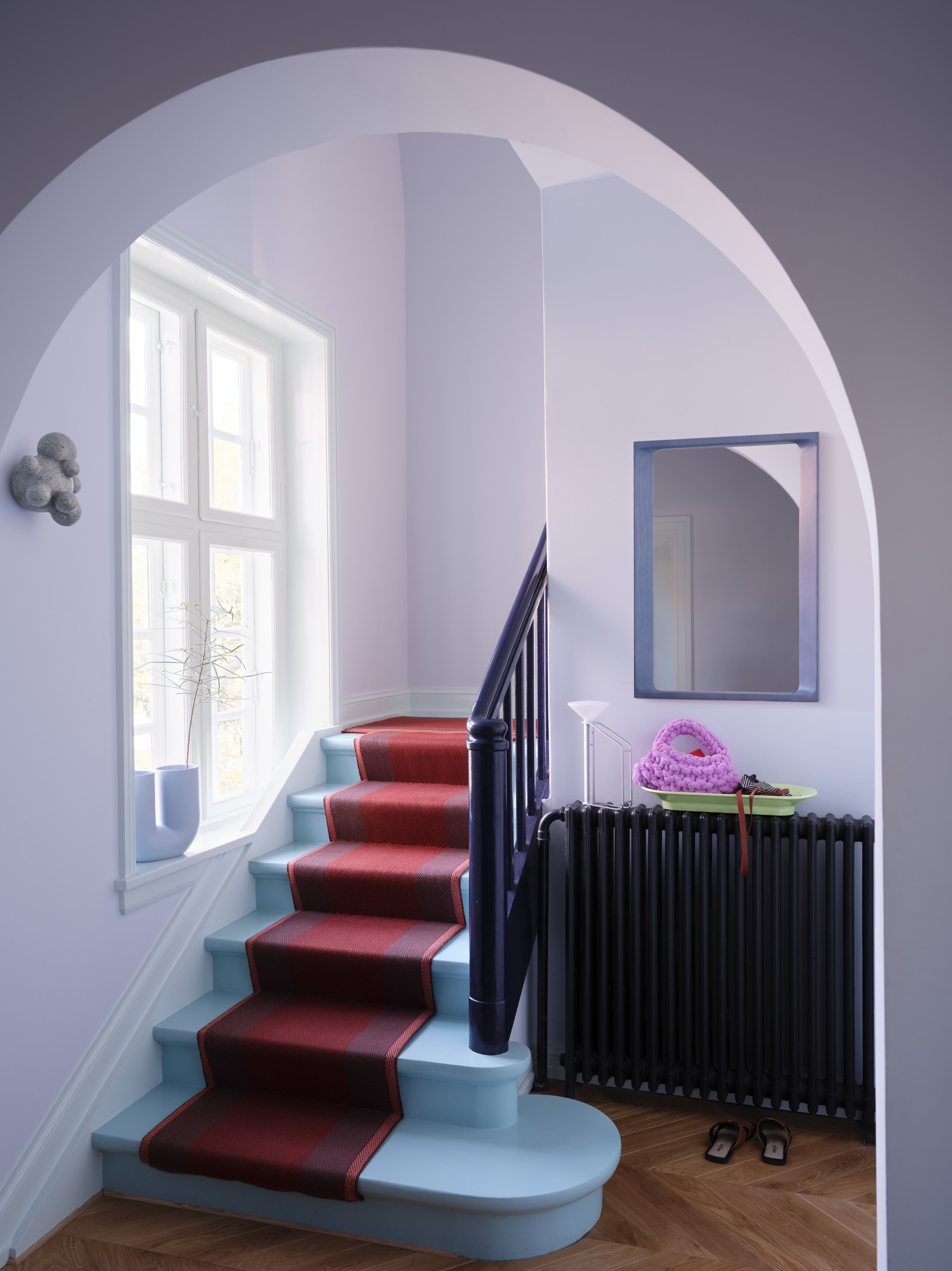 • An arced mirror with a midnight blue frame by Muuto. The design is minimalist with a smooth, rounded top and a thin border. The rich blue frame adds elegance to the mirror, giving it a modern and sophisticated appearance.