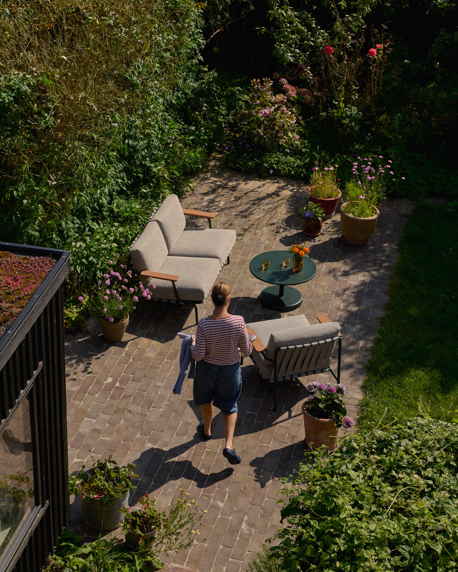 Rooted in Scandinavian heritage, the Settle Outdoor Seating Series blends functionality and aesthetics with materials like smooth powdercoated steel, warm wooden armrests